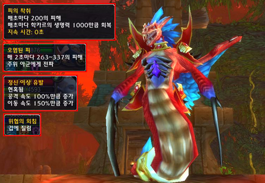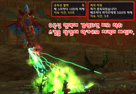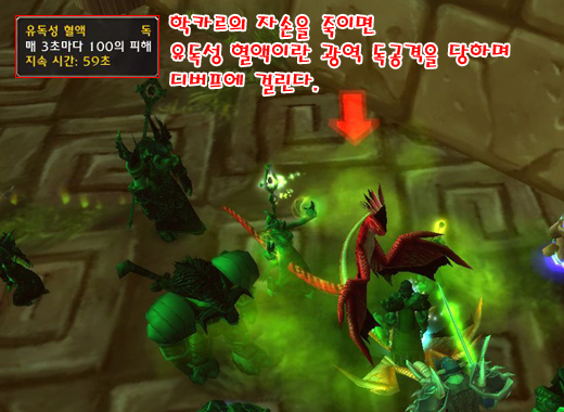 5. 학카르는 약 40 ~ 60초 주기로 광역 흡혈을 사용하니 그 중간 시간에 지속적으로 학카르의 자손을 죽여 유독성 혈액에 감염되자. 이렇게 각 시간마다 유독성 혈액을 당하면서 메인 탱커를 살리면 학카르를 쓰러트릴 수 있다. 유의할 점은 메인 탱커에게 사제와 드루이드의 도트힐이 꾸준히 걸려 있어야 하는 것이다. 흡혈을 당할 때 체력이 약간씩 떨어지고 스턴 상태가 되기 때문에 타이밍을 놓치면 메인 탱커를 눕힐 수도 있다. 지속적인 독 감염과 메인 탱커를 눕히지 않는다면 충분히 학카르를 쓰러트릴 수 있다.