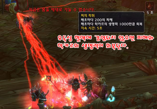 2. 학카르는 오염된 피 광역 흡혈 세뇌 등등 상당히 강력한 스킬을 행한다. 그 중 가장 유의해야 할 점은 학카르가 절대로 이동하지 못하게 하는 것이다. 만약 학카르가 이동을 하여 오염된 피가 몰려있는 공대원에게 맞게 되면 전멸을 피할 수 없다. 오염된 피는 263-337의 대미지를 주며 주변 아군에게 전파된다. 한마디로 몰려있는 곳에 이 디버프가 걸린 사람이 있으면 공대원 전부가 이 디버프에서 벗어날 수 없다.