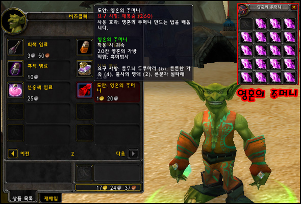 재봉 기술을 통해 영혼의 조각을 담을 수 있는 가방을 만들 수 있습니다. 가장 작은 가방은 20 칸 가방으로 가젯잔에서 도안을 구입할 수 있습니다. 이보다 큰 가방의 도안은 스칼로맨스에서 구할 수 있고 더 큰 가방의 도안은 화산 심장부에서 구할 수 있습니다. 메인 UI에서 이 조각 가방에 조각이 몇 개나 들어 있는지 표시될 것입니다. 공간이 남아 있는 한 흑마법사가 만드는 영혼의 조각은 자동으로 영혼의 조각 가방에 들어갑니다.