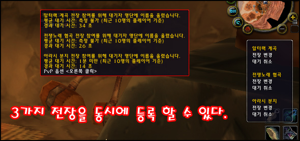 이제는 하나가 아닌 여러 전장 대기열에 이름을 올릴 수 있게 됩니다. 이로써 어느 대기열에 이름을 올릴지 고민할 필요가 없게 됩니다. 세 대기열에 모두 올려놓고 가장 먼저 자리가 나는 전장에 들어가도 되고 아니면 원하는 전장의 자리가 날 때까지 기다렸다가 들어가도 됩니다. 또한 전장에 입장한 이후에도 다른 전장의 대기열은 유지되므로 다른 전장에 자리가 났을 경우 해당 전장으로 이동하거나 이미 입장한 전장에 남아 있을 수 있게 됩니다.