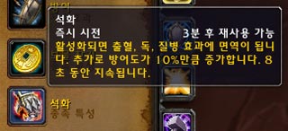 패치 전 석화는 이동 속도가 평소의 70%로 감소하고, 방어도 증가도 5% 밖에 되지 않았지만 1.90 패치로 이동 속도 저하는 사라지고, 방어도는 10%까지 증가하게 되었다. 하지만 지속 시간이 20초에 8초로 엄청나게 줄어들어 조금은 아쉬움이 남는다.