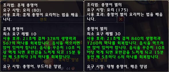 직접 확인한 곳은 오그리마와 아이언포지에 있는 전문 요리사 근처에 있는 요리 재료 상인이 파는 조리법이다. 체력과 마나를 모두 회복 시켜주고, 마나 회복 버프까지 걸어주는 환상의 음식! 하지만 아직 총명어를 잡을 수 있는 정확한 위치에 관한 정보는 구하지 못했다. 섬 근처라는데 어디란 말인가!? @_@? 요리 숙련도와 비슷한 섬에서 잡을 수 있지 않을까? 이럴줄 알았으면 낚시 좀 올려두는건데...(낚시 숙련도 60의 애환)