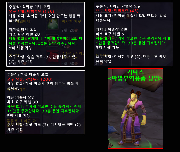 • 마법부여를 익힌 플레이어들은 가루와 결정을 마법 오일로 바꿀 수 있습니다. 이 오일을 무기에 사용하면 마법 피해 보너스나 마나 재생 효과를 얻을 수 있으며 미리 걸려 있던 다른 영구적인 효과와 중첩하여 사용할 수 있습니다. 이러한 종류의 저레벨 주문식은 일반적인 마법 부여 상인에게서 살 수 있으며 고레벨의 주문식은 특수 상인에게 사거나 잔달라 부족에 대한 평판이 높으면 보상으로 받을 수 있습니다.