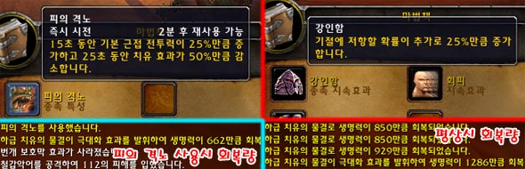 피의 격노 사용 효과는 변하지 않고, 사용 후 받게되는 패널티 때문에 개인적으로 사용하기가 더욱 싫어졌다. 위에 이미지에서 볼 수 있듯이 힐량이 완전히 반으로 뚝 떨어지는 디버프가 무려 25초 동안 지속된다. 또한 이 디버프는 피의 격노 사용과 동시에 얻게 되는 패널티여서 인던 사냥이나 전장에서 제일 전방에서 싸우게 되는 오크 전사의 생명줄인 힐량을 줄여 버리는 디버프라니?!
