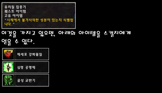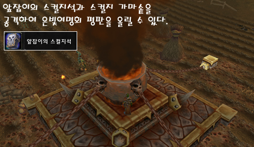 ◈가마솥 공격을 하기 위해선 스컬지 가마솥 퀘스트를 완료해야 하며 연금술사 디더스(호드), 연금술사 알빙턴(얼라)에게서 유리질 집중기를 받아서 가방에 가지고 스컬지를 사냥하면 체세포 강화물질, 심령 공명체, 골성 교반기를 구할 수 있다.