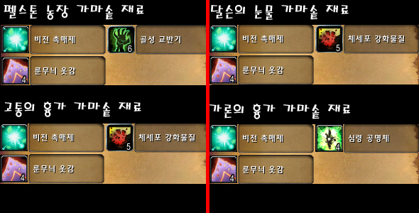 스컬지 가마솥을 공격하기 위해 필요한 재료는 아래와 같다. 비전 촉매제는 연금술사 디더스(호드), 연금술사 알빙턴(얼라)이 판매한다. 비전 촉매제는 30분 후에 사라지니 다른 재료를 준비한 뒤 구매하자.