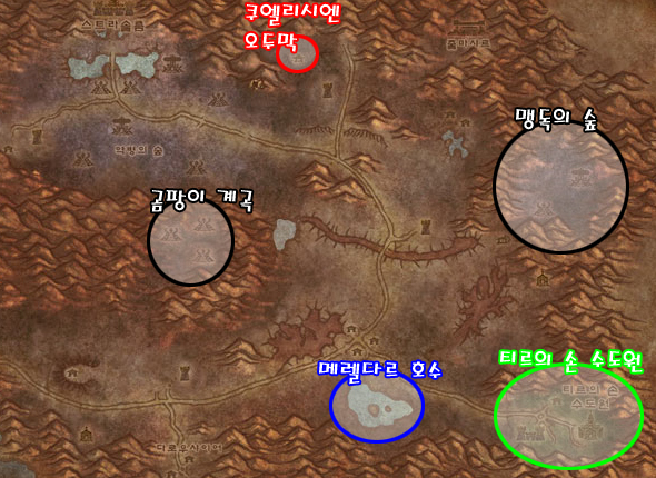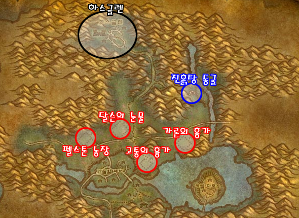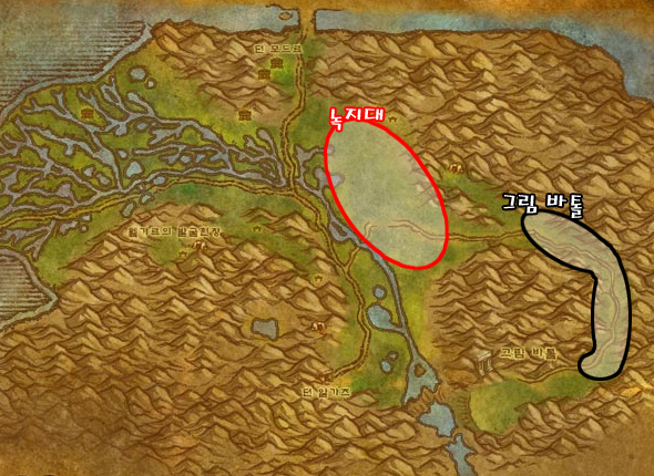 성전사 마부식으로 유명한 하스글렌과 은빛여명회의 평판 작업을 할 수 있는 4개의 농장이 이곳의 주요사냥터이다. 앞으로 열릴 안퀴라즈를 대비해 진흙탕 동굴에서 상급자연보호 물약 도안을 얻는 것도 좋다.