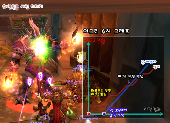 이 때문에 초반에 어그로를 많이 가져갔던 탱커와 전사들의 어그로 수치가 중반 이후 다른 직업, 특히 마법사와 흑마법사들에게 역전되는 상황이 발생한다. 만약 특별한 어그로 조절이 없다고 가정한다면 다음 그래프와 같은 현상이 나타난다.