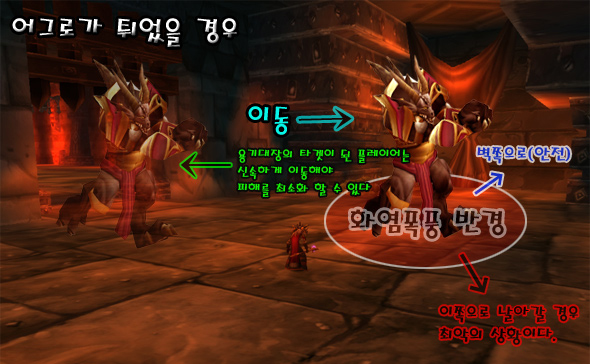 용기대장을 잡는 진형은 탱커가 문을 등지고 탱킹을 하고 대미지딜러는 오른쪽 구석에서 댐딜을 하는 것이 일반적이지만 그 반대로 진형을 잡는 경우도 있다. 어느 쪽으로 진형을 구축하든 별 상관은 없지만 화염폭풍을 맞았을 시 어느 쪽으로 날라가더라도 새끼용이 애드 되지 않는 자리를 잡아야 한다.