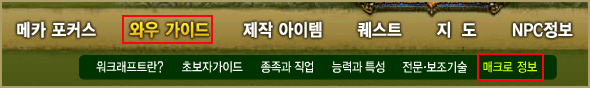 게임을 보다 쉽게 그리고 고수가 되는 지름길 바로 여기에 있습니다. 상단메뉴 [와우 가이드]▶ [매크로 정보]를 클릭 하시면 매크로 기본정보, 함수정보, 직업별 매크로 페이지를 확인할 수 있습니다.