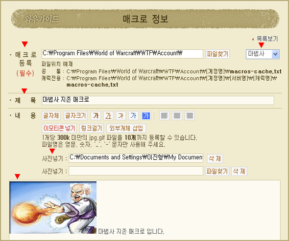 해당 매크로를 등록 했다면 등록될 직업과 제목, 내용 그리고 사진을 입력하신 뒤 등록 버튼을 클릭 합니다.