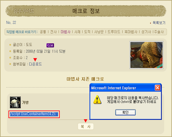 매크로 정보와 직업별 게시판 사용 중 잘못된 점이나 건의 사항이 있으신 분은wowmeca@gamemeca.com 으로 메일을 보내주시기 바랍니다. 그리고 정보 이용 중 좋다고 생각하는 게시물은 추천 버튼 눌러주는 센스도 잊지 마세요 ^^