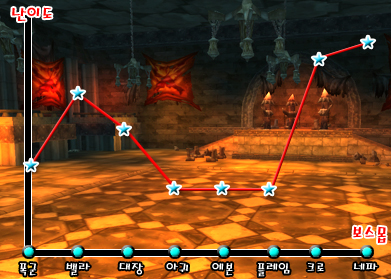 검은날개둥지는 공격대의 특성(공격적, 안정적)에 따라 난이도의 변화가 심하고 호드와 얼라진영에 따라서도 공략법이 다르기 때문에 그래프는 의미가 없을지 모른다. 그래도 일단 말로 설명하는 것보단 눈으로 보는 것이 백번 낫기에 포토샵으로 한번 요리해 보았다.
