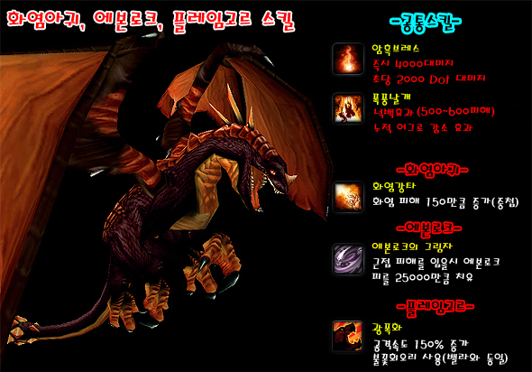 다만 두 드레이크의 고유 스킬이 좀 까다롭다. 화염아귀가 화염강타란 고유스킬을 가지고 있었다면 에본로크는 “에본로크의 그림자”라는 고유스킬을 플레임고르는 “광폭화”란 고유스킬을 가지고 있다.