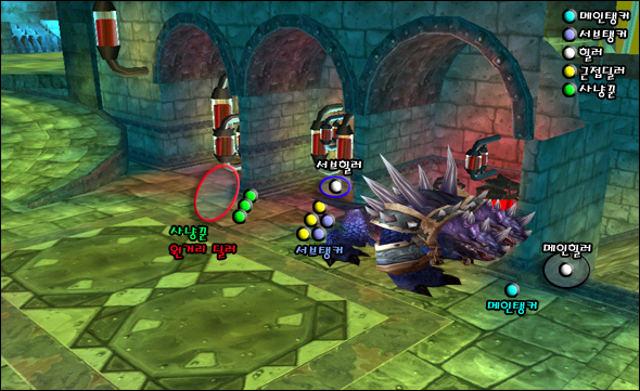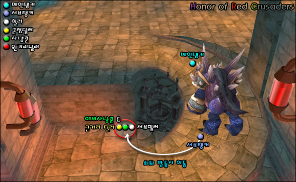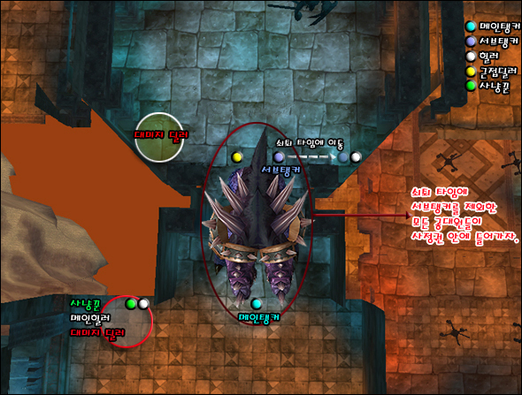 이 진형의 최대 단점은 전멸할 경우 위쪽에 위치한 플레이어들은 크로 어그로 범위에 걸려, 무덤에서 달려야 한다(-_-;).