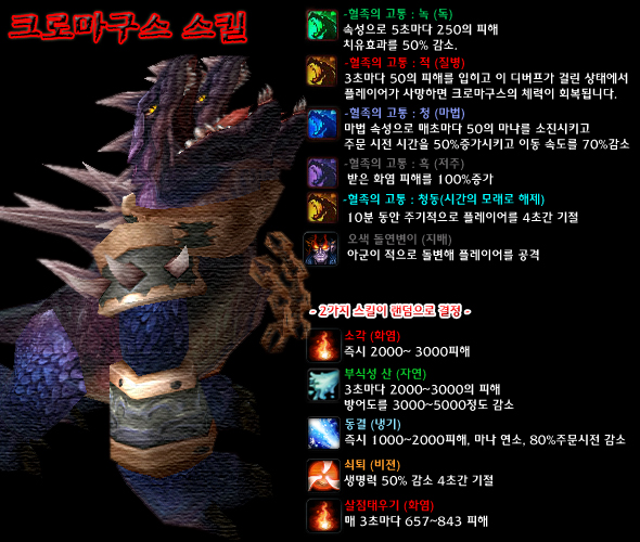 -혈족의 고통 : 적 - 질병 속성으로 3초마다 50의 피해를 입히고 이 디버프가 걸린 상태에서 플레이어가                               사망하면 크로마구스의 체력이 회복