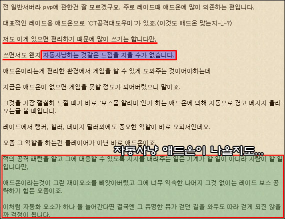 PVP의 강자가 되기 위해 모든 스킬의 타이밍을 손가락이 기억할 정도로 노력한 유저들이 분명히 있었다. 하지만 지금은 어떠한가? 엄청난 노력을 통해 몸에 익힌 사람과 애드온을 사용하는 사람과의 차이가 없다고 봐도 과언이 아니다. 노력한자와 하지 않은 자의 차이가 없다면 누가 노력을 하겠으며, 무슨 재미를 느끼겠는가...