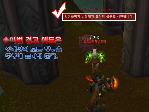 많은 유저들이 애용하는 "마법 경고 애드온" 거의 모든 클래스에게 도움이 되는 좋은 애드온이다. 언제 어디서나 적의 행동을 확인할 수 있어 급작스러운 원거리 마법공격, 사냥꾼의 죽은척하기, 도적의 은신 등등 모든 것을 즉시 대처할 수 있다.
