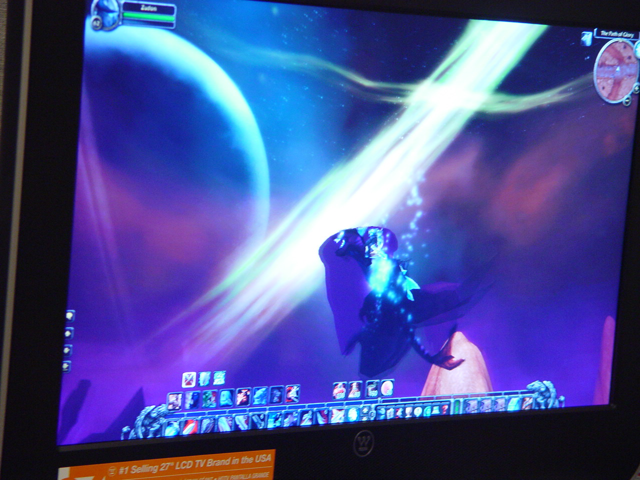 쉐인: 우선 62레벨 캐릭터를 통해 설명 하겠다. 이 케릭터는 6월에 업데이트되는 낙스라마스 패치 때 볼 수 있을 상위 방어구 세트 착용한 캐릭터다. 캐릭터가 서 있는 장소는 ‘어둠의 문(다크 포탈)’이다. 확장팩 공개 시기에 (안퀴라즈 때와 비슷한 형식으로) 월드 이벤트를 통해 어둠의 문이 열릴 것이다. 어둠의 문에 입장하면 뒤로는 아제로스를 바라볼 수 있고, 앞에서는 외계에 떨어진 듯한 느낌을 받을 것이다. |