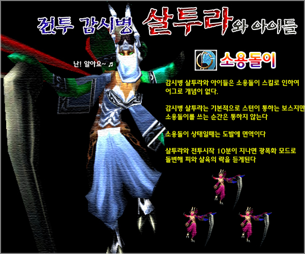 살투라 진형은 전문에서 밝혔듯이 한치 빈틈없는 진형구축이 아니라 상황에 맞게 대처하는 공격대원들의 개인기량이 더욱 중요하다고 할 수 있다. 하지만, 고스톱을 치더라도 기본 룰을 알아야 박을 면할 수 있듯(-_-;) 살투라와 그 부하들의 특성을 알아야 수월한 공략을 할 수 있다.