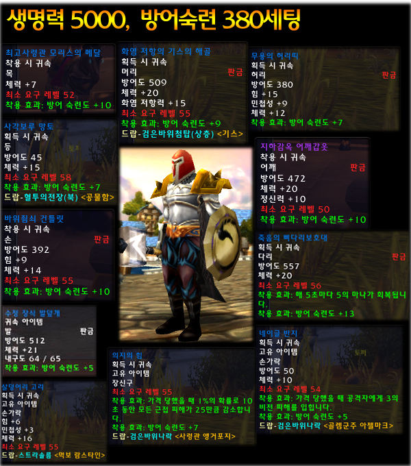 인던이나 퀘스트, 필드드랍, 아이템을 가지고 방숙 380이상 생명력 5000이상이 나온다는