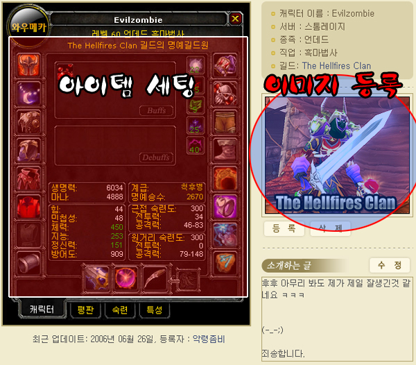 가지고 계신 아이템은 캐릭터 프로필을 통해 올려주시고 세팅된 이미지는 이미지 등록란에 올려주세요. 참! 한번 등록된 프로필은 이벤트가 끝나기 전까지 업데이트 하시면 안됩니다. ^^;