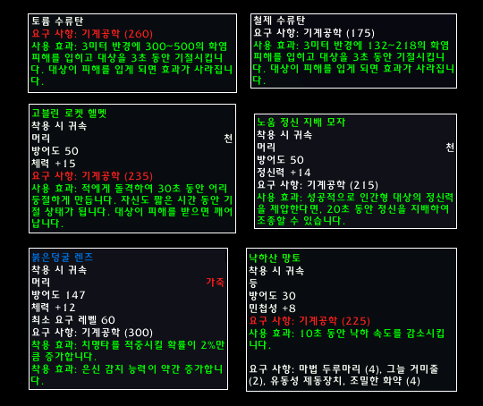 "붉은덩굴 렌즈"는 도적과의 전투시 좀더 유리한 고지로 올려주고 "낙하산 망토"의 경우 올라프의 다목적 방패와 마찬가지로 제재소에서 대장간으로 빠른 이동을 할 수 있게 해준다.