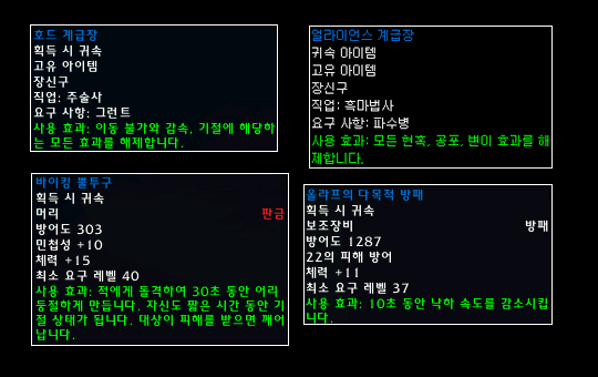 "바이킹 뿔투구"와 "올라프의 다목적 방패"는 호드 플레이어만 구할 수 있는 아이템으로 울다만의 드워프 3인에게서 얻을 수 있다. 바이킹 뿔투구는 재사용시간이 30분이라 약간 아쉽지만 적을 무력화시킬 수 있어 매우 쓸만하다. 올라프의 다목적 방패는 제재소에서 대장간으로 바로 이동할 때 도움을 주고 "낙하산 망토"와 달리 전투 중에도 갈아낄 수 있다는 큰 장점을 지니고 있다.
