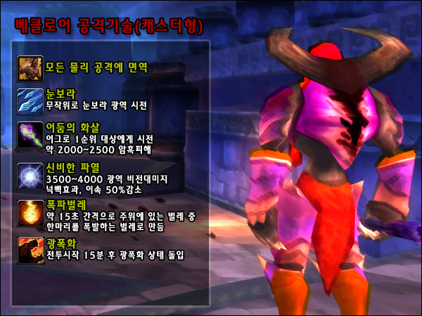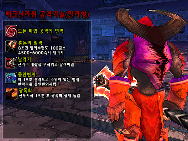 베크닐라쉬는 마법공격은 면역이지만 물리 공격은 100%로 통하므로 일반적인 전사탱킹에 아무런 문제가 없다(물론 공격이 엄청나게 세긴 하지만). 하지만, 베클로어의 경우 물리 공격에 면역이기 때문에 전사가 어그로 스킬을 쓸 수 없어 텔레포트 직후 생성되는 반경 어그로만 먹어야 한다는 것이다.