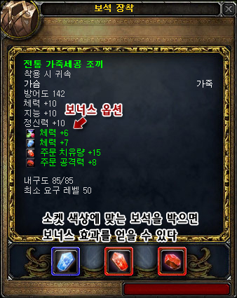 원하는 보석 3개를 박을지 아니면 보너스 옵션을 얻기 위해 색깔에 맞는 보석을 박을지는 보너스 옵션의 성능에 따라 달라지겠죠 ^^:
