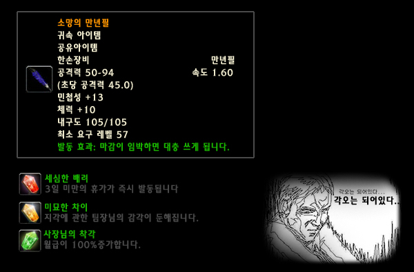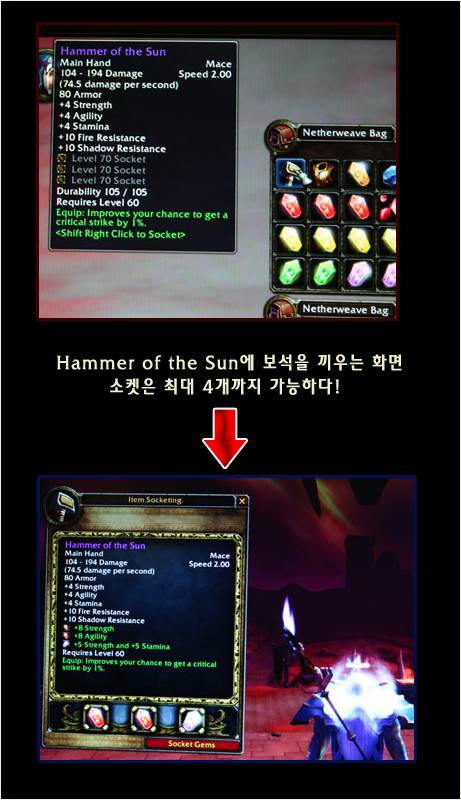 다행이 <와우>의 귀속 시스템 덕분에 무분별한 아이템 거래는 없겠지만 희귀 보석의 가치가 어떤 식으로 올라갈지 궁금할 따름입니다(몬스터 드롭 보석마저 귀속이라면.. 어쩔 수 없지만)