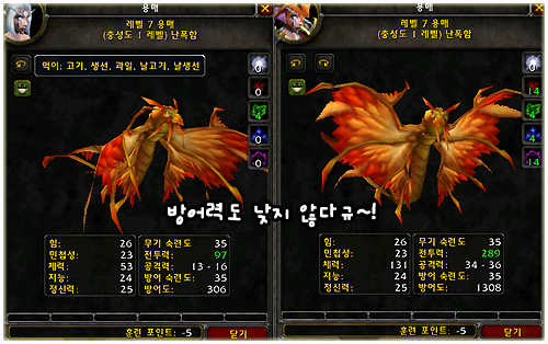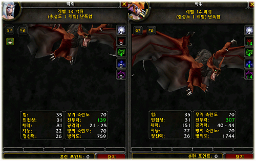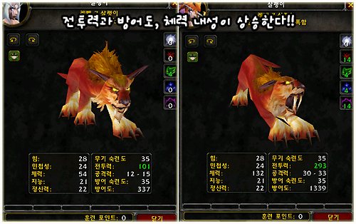 ▲ 캐릭터의 장비 착용 전과 후의 야수 능력치 비교