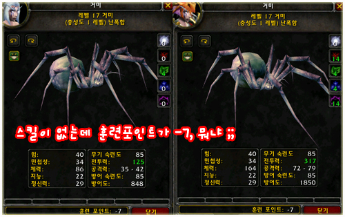 물레거미의 특이한 점은 가지고 있는 고유스킬이 없는데도 훈련포인트가 -7이라는 점이다. 아마 버그인듯 싶다. -7이나 소비하는 고유 스킬이라... 2차 클베때는 꼭 공개되었으면 하는 바람이다.