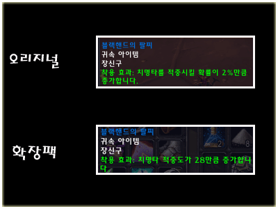 블랙핸드의 팔찌라는 아이템을 예로 들어 보겠다. 지금은 단지 치명타 적중률 2%로 절대값는 아이템이지만 확장팩에서는 치명타 레이팅 28이라는 옵션을 갖게 되며, 이 수치는 레벨60일 경우엔 치명타 적중률 2%의 효과가 있으며 만약 레벨이 70인 유저가 이 아이템을 착용하게 되면 치명타 적중률이 1.x%의 효과가 된다.