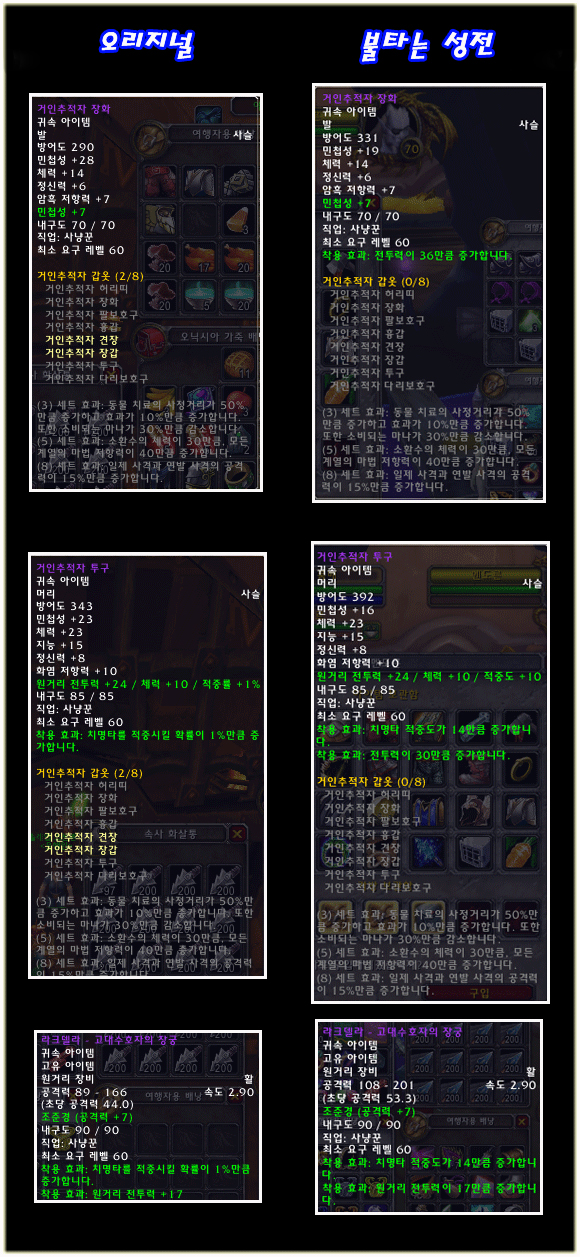 예전엔 민첩 위주의 능력치를 갖고 있던 세트 아이템은 민첩과 전투력이 적절히 배분되어 있고, 사냥꾼의 주 무기인 활, 총 등의 원거리 무기들은 최소 대미지와 최고 대미지, 초당 대미지가 많이 증가하였다.