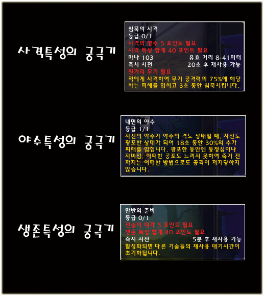 능력치와 아이템 못지 않게 특성과 기술 부분에도 흥미로운 발전이 있었다. 3가지 특성에 각각 강력한 궁극기가 등장했으며 레벨업을 통해 상급 사냥꾼에게 배울 수 있는 새로운 스킬도 등장하였다. 세 가지의 궁극기 모두 PVP나 레이드 시 뛰어난 성능을 보일 것으로 예상되는 기술들이다.