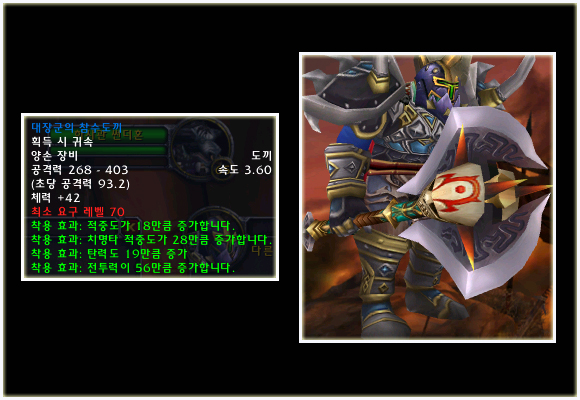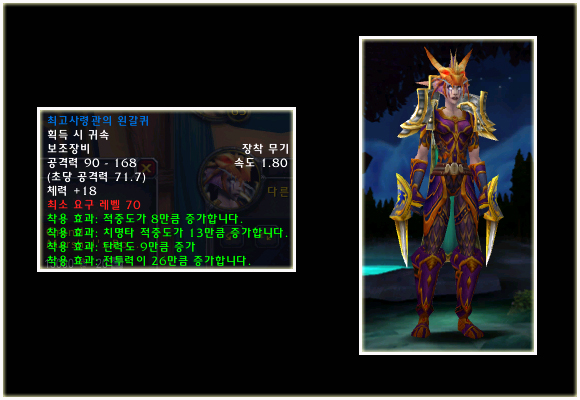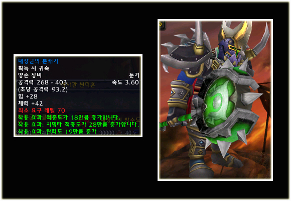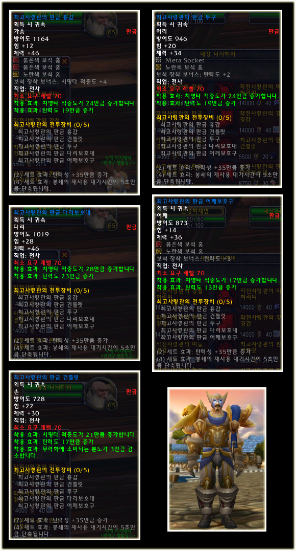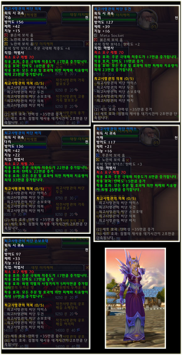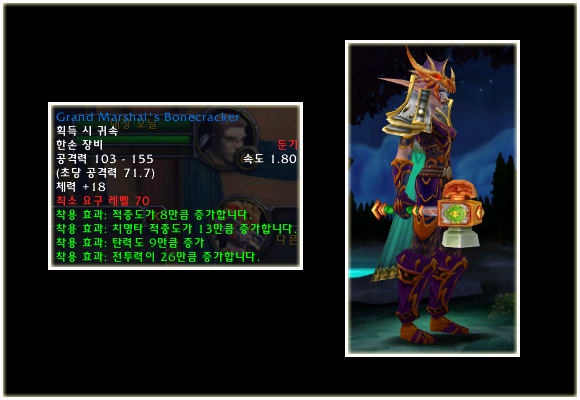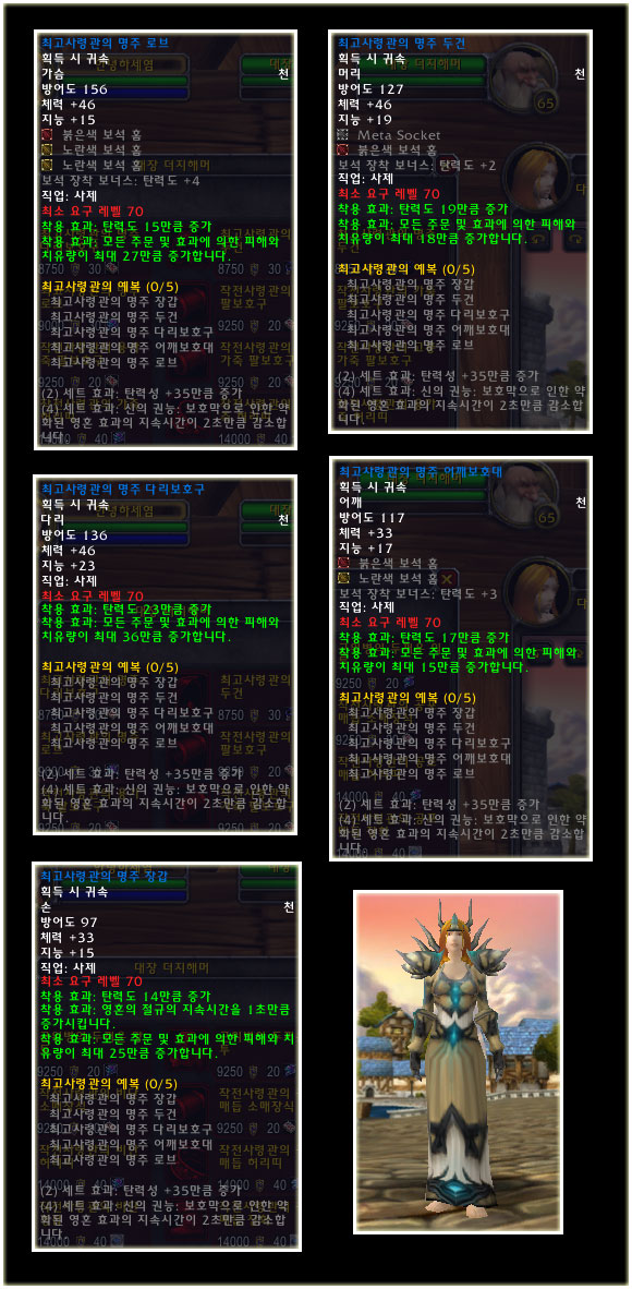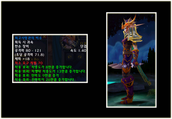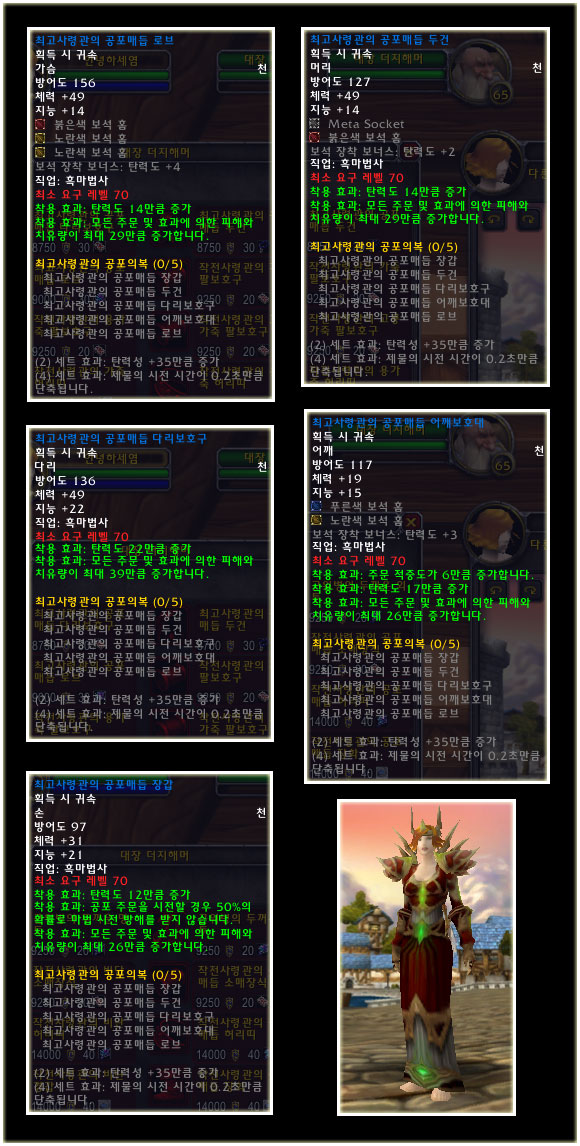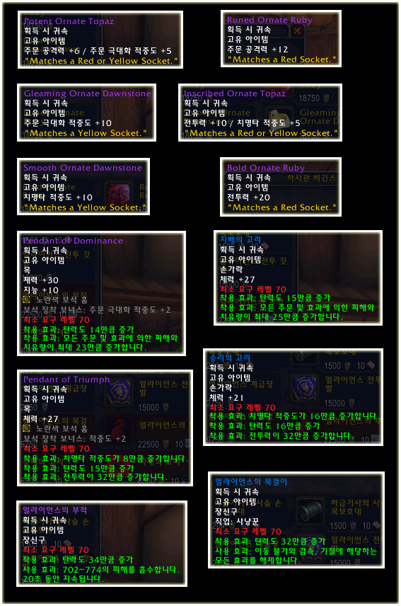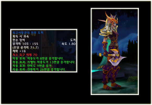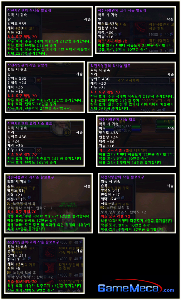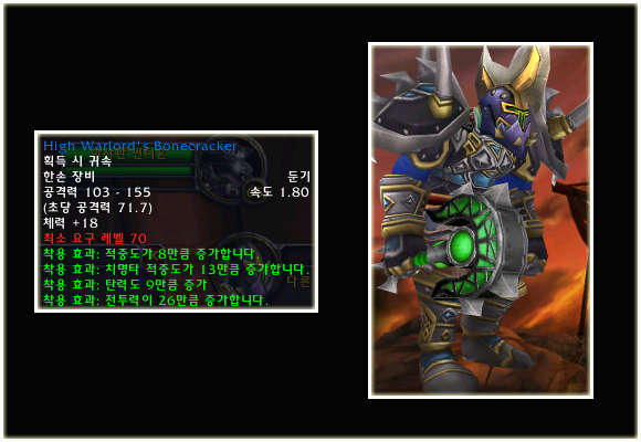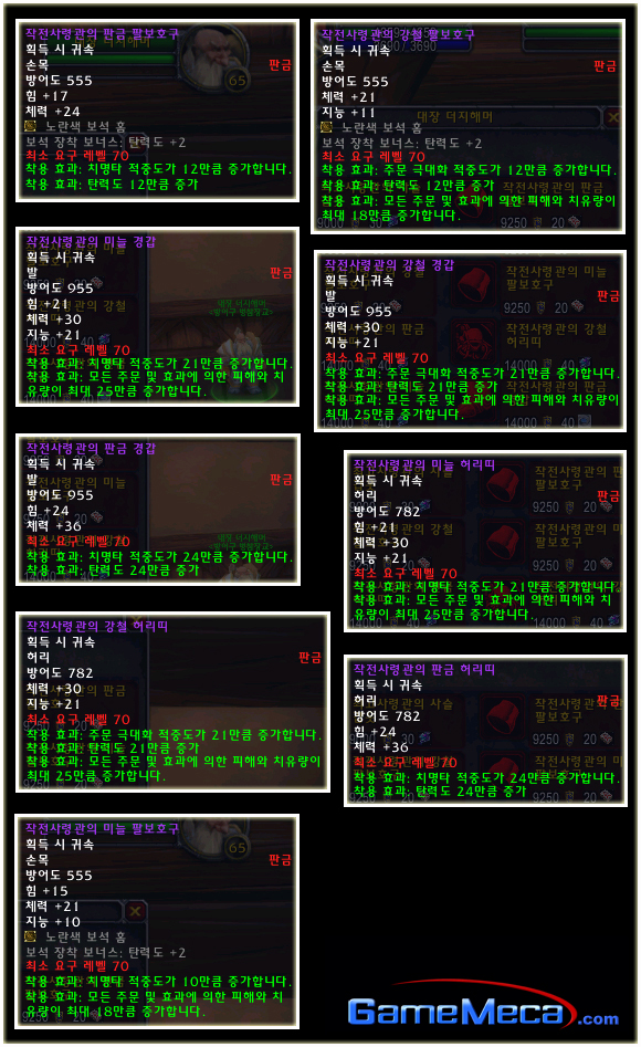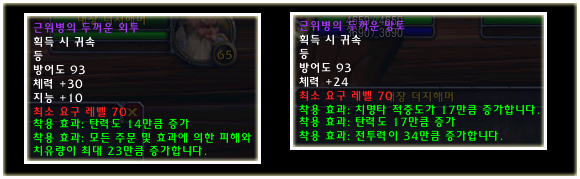 최고 레벨이 70으로 상승되기에 레벨 제한 70의 아이템들도 당연히 등장했다. 이번 패치(2.0.1)에는 등장하지 않는 아이템이지만 확장팩에 나올 것이기에 한 번 살펴보도록 하자. 성기사나 주술사의 경우 두 가지의 방어구 아이템이 있는 것을 볼 수 있다.