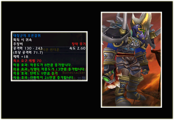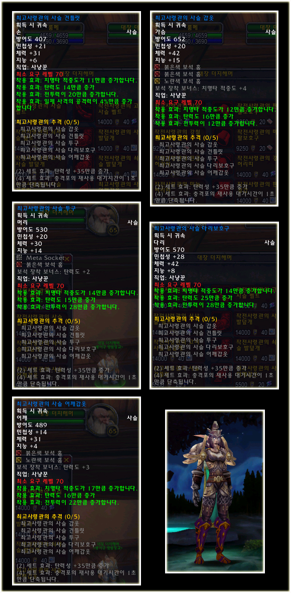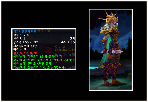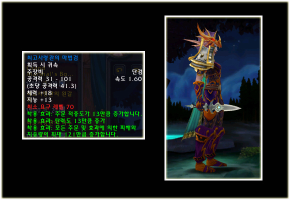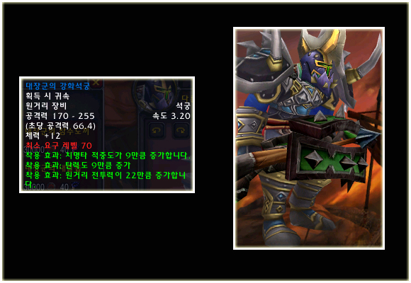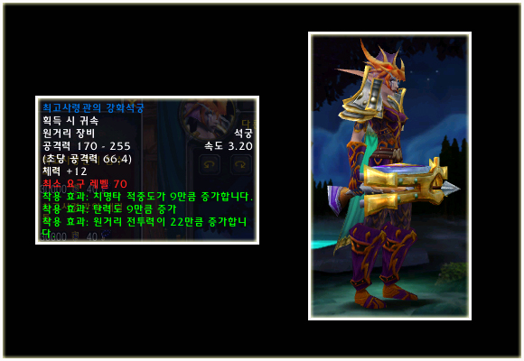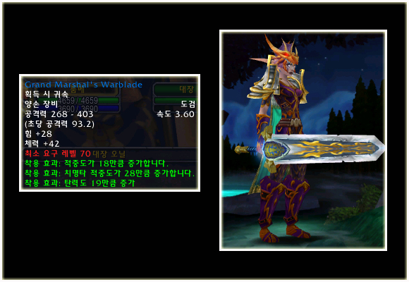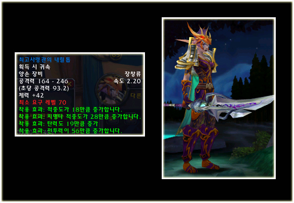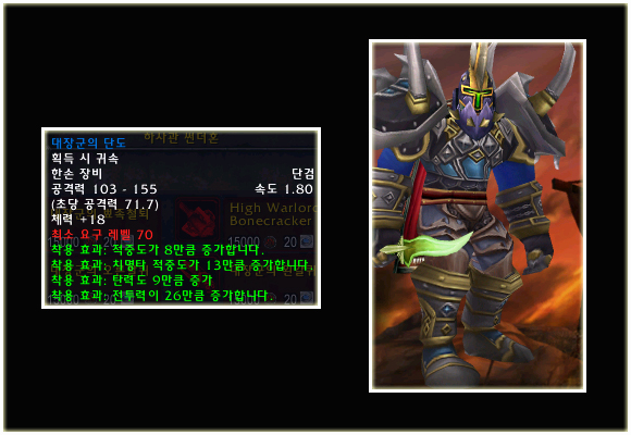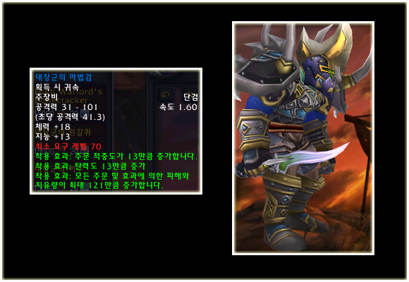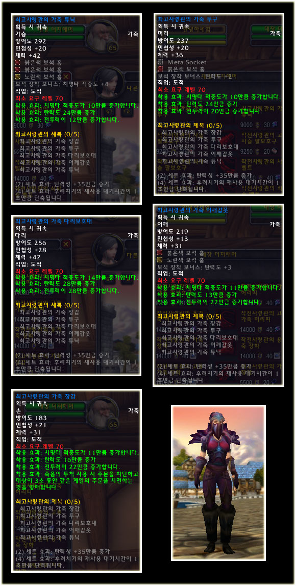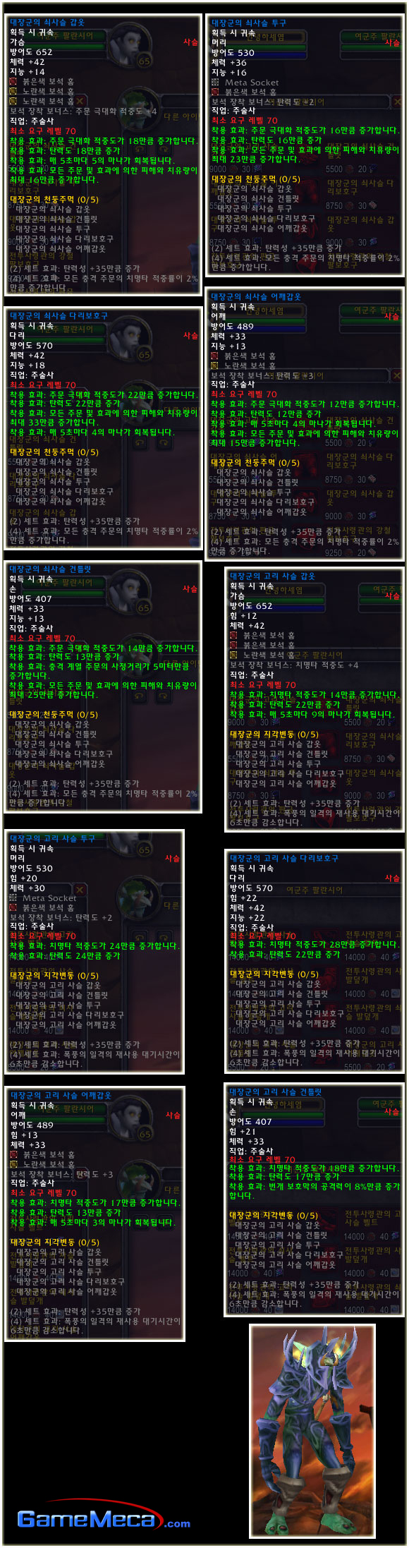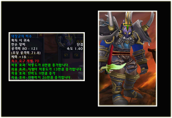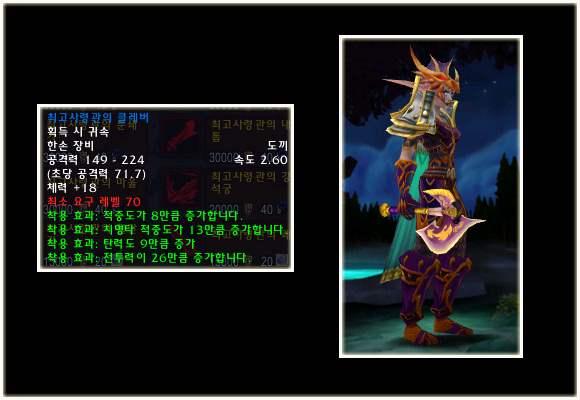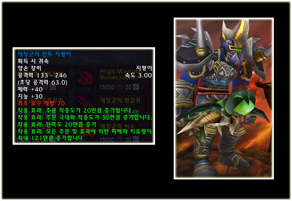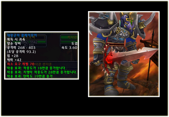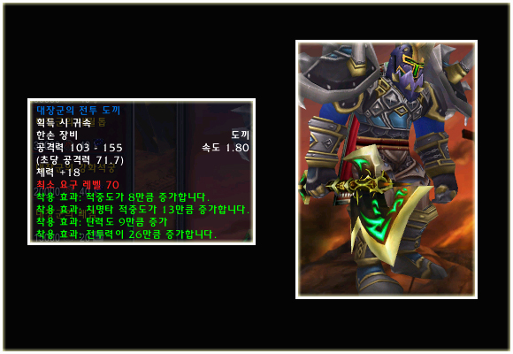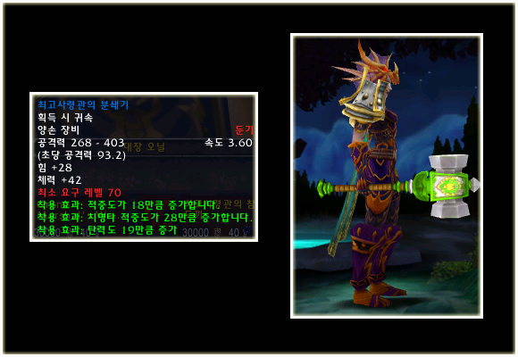 최고 레벨이 70으로 상승되기에 레벨 제한 70의 아이템들도 당연히 등장했다. 이번 패치(2.0.1)에는 등장하지 않는 아이템이지만 확장팩에 나올 것이기에 한 번 살펴보도록 하자. 성기사나 주술사의 경우 두 가지의 방어구 아이템이 있는 것을 볼 수 있다.