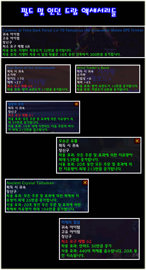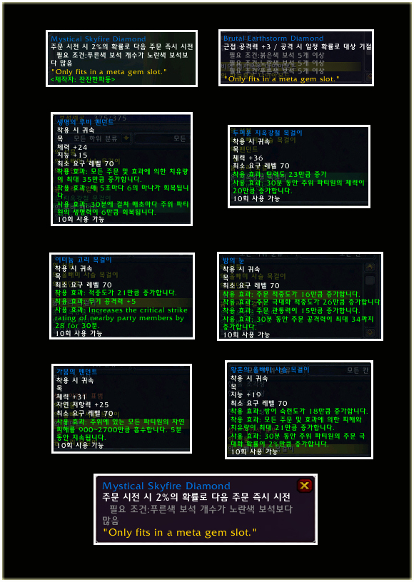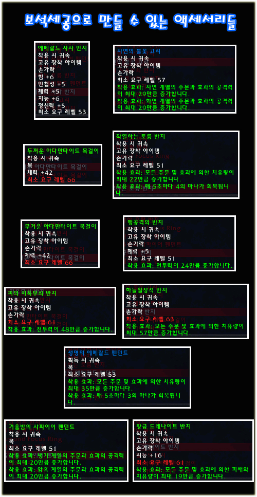 하늘월장석 반지, 무거운 아다만타이트 목걸이, 두꺼운 아다만타이트 목걸이, 최상급 암흑 드레나이트, 예리하게 빛나는 불꽃석류석, 매끄러운 황금 드레나이트, 강도 높은 황금 드레나이트 등 |