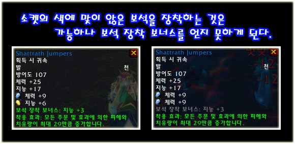 아이템에 보석을 장착하는 방법은 소켓이 있는 아이템 위에 마우스를 올리고 Shift+마우스 우 클릭을 하면 아래 그림과 같은 보석 장착 창이 뜬다. 이 상태로 가방의 보석을 드래그하여 장착 창에 넣으면 된다.