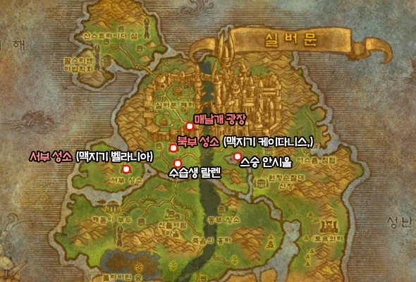 `북부 성소에 물건 배달`《상단의 영원노래 숲 주요 NPC - 맵1을 참고》퀘스트는 매날개 광장의 남서쪽에 있는 북부 성소를 찾으면 된다. 이곳에 들러 "맥지기 케이다니스"와 대화를 나누어 퀘스트를 완료한 뒤 연계 퀘스트인 [고장난 서부 성소]를 받도록 하자. `고장난 서부 성소` 퀘스트는 북부 성소에서 서쪽으로 내려가면 찾을 수 있다. 이곳에 도착하면 "맥지기 벨라니아"와 대화를 통해 퀘스트를 완료한 뒤 [불안정한 성소]를 받고 `나이트 엘프 침입` 퀘스트와 함께 진행을 하면 된다.