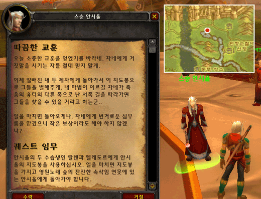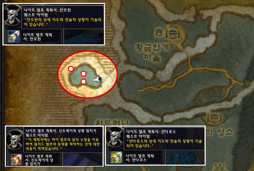 이 중 `나이트 엘프의 침입자`를 진행하면 무조건 [첩보 문서]퀘스트 시작 아이템을 얻을 수 있다. 이 첩보 문서를 읽어 퀘스트를 받고 맥지기 벨라니아에게 돌아가`불안정한 성소`를 마무리 짓고 `첩보 문서`를 매날개 광장에 있는 엘론 선브랜드에게 가져가자.