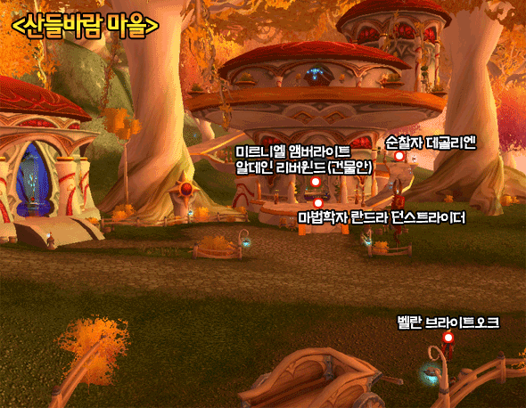 이 퀘스트들을 전부 처리했으면 해돋이 부두 앞 막사를 둘러 퀘스트를 완료시키고 산들바람 마을로 다시 돌아가 `해돋이 부두의 상황` 퀘스트를 완료하자. 이후 순찰자 데골리엔은 [원정순찰대 산장]퀘스트를 준다. 그리고 여관 앞 마법학자 란드라 던스트라이더에게서 [유령의 땅에서 실종된 조카]퀘스트를 받도록 하자. 자 이제 이동할 곳은 바로 남서쪽의 불타버린 숲이다. 이곳으로 진행하면서 `마법석 파수꾼 데리안`, `불타버린 숲`퀘스트를 진행해보자.