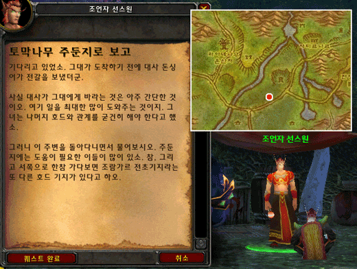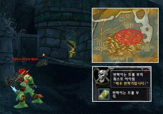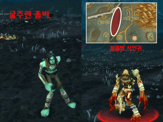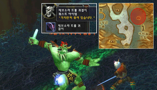 그럼 이번에는 `제브텔라 공격`과 `그림자소나무 트롤의 무기`, `살짝 양념 치기`를 진행해보자. 이 3개의 퀘스트는 초소 동쪽에 위치한 그림자소나무 트롤들을 처치하면서 진행이 가능하다. 여기서 `그림자소나무 트롤의 무기`는 인간사냥꾼과 흑마술사 밖에 없기 때문에 절반만 진행이 가능하며 `살짝 양념 치기`는 진행이 불가능하니 우선 2개의 퀘스트만 진행을 하고 초소로 돌아가 `제브텔라 공격`의 연계 퀘스트인 [제브노와 공격]퀘스트를 받도록 하자.