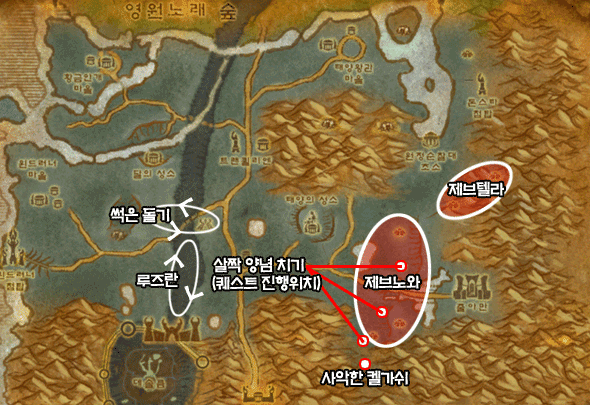 이 퀘스트는 초소 남쪽에 있는 제브노와에서 진행을 하면 되고 `그림자소나무 트롤의 무기`, `살짝 양념 치기`를 함께 완료할 수 있다. 또한 `현상 수배: 사악한 켈가쉬`도 같이하면 좋으니 파티를 구성해서 진행을 하자. 사악한 켈기쉬는 정예 20레벨의 트롤이라 대단히 어려우니 최소 3명 이상의 파티를 구성해 도전하자.