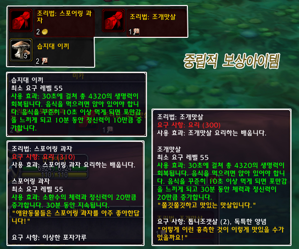 스포어가르의 평판 보상아이템은 스포어가르 평판 + 초롱버섯으로 교환하여 얻을 수 있습니다. 만약 본인의 전문기술이 약초채집이면 미니맵에 초롱버섯 위치가 나타납니다. 중립적에서 살 수 있는 조리법: 스포어링 과자는 사냥꾼 "팻"의 요리버프로서 이번 확장팩에서 새롭게 추가된 "팻"전용 요리입니다.