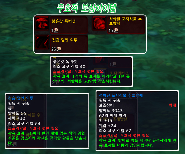 이 글은 `불타는군단` 서버의 `안다이어`님이 확장팩 플레이 하면서 얻은 정보를 보내주신 것으로 `장가르습지대` 지역의 `스포어가르` 평판에 대한 내용입니다. 정말 좋은 글 보내주셔서 진심으로 감사드립니다.