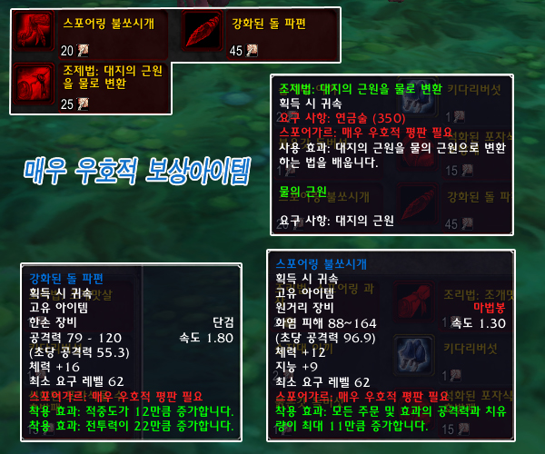 왠지 "골룸"의 포스가 느껴지는 스포어가르 종족 평판은 "보상아이템이 별로 끌리지 않는데?"라는 말이 절로 나올만큼... 색다른 아이템이 없습니다. 패치로 보상아이템이 새로 추가되지 않는 이상 큰 인기를 얻을 수 있을것 까진 않군요 ^^ .. end F A I N