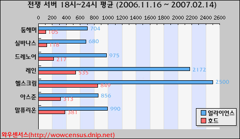 와우센서스(http://wowcensus.dnip.net)에서 일반서버와 전쟁서버를 검색해 가장 인구비율(호드와 얼라)이 안 좋은 서버를 모아봤습니다. 통계는 2006.11.16~ 2007.2.14일까지의 집계 결과를 산출했으며 결과는 다음과 같습니다.