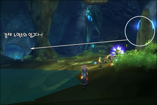 수중을 헤엄쳐 도착하면 육지에 닿게 되고 그곳에 만남의 돌이 있다. 만남의 돌이 있는 곳은 갈퀴송곳니 저수지 인던들의 입구가 모여 있는 곳이며 이곳에서 4군데의 인던 중 한 곳을 선택하여 입장한다. 지금 공략하려는 인던인 `강제 노역소`는 만남의 돌을 바라보고 가장 왼쪽 가장자리에 입구가 있다.
